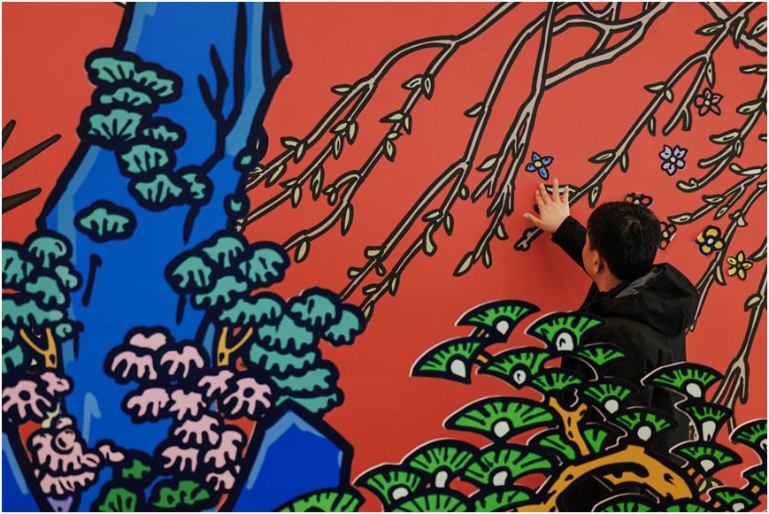 互動區(qū)——“送你一朵小紅花” “送你一朵小紅花”互動裝置打造了卜樺作品《春風(fēng)拂面》中太陽灑下溫暖光芒、祥云飄逸靈動、柳樹輕拂微風(fēng)、山峰屹立巍峨的自然仙境,構(gòu)建出極具沉浸感的互動場景。市民朋友可以在花朵貼紙上寫下對生活、對未來的美好愿望,并將其貼于背景墻上,用愛與期待編織希望的篇章。